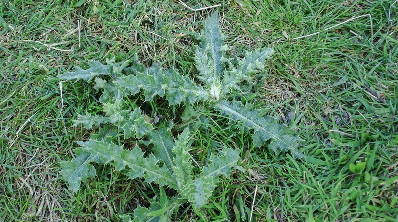 This is a weed that grows straight up in the air and has a prickly stem and can be painful to the touch. It can also grow a purple flower at the top if left alone too long. This weed is also very difficult to kill because it has a waxy cover on the exterior. It will likely take multiple applications.