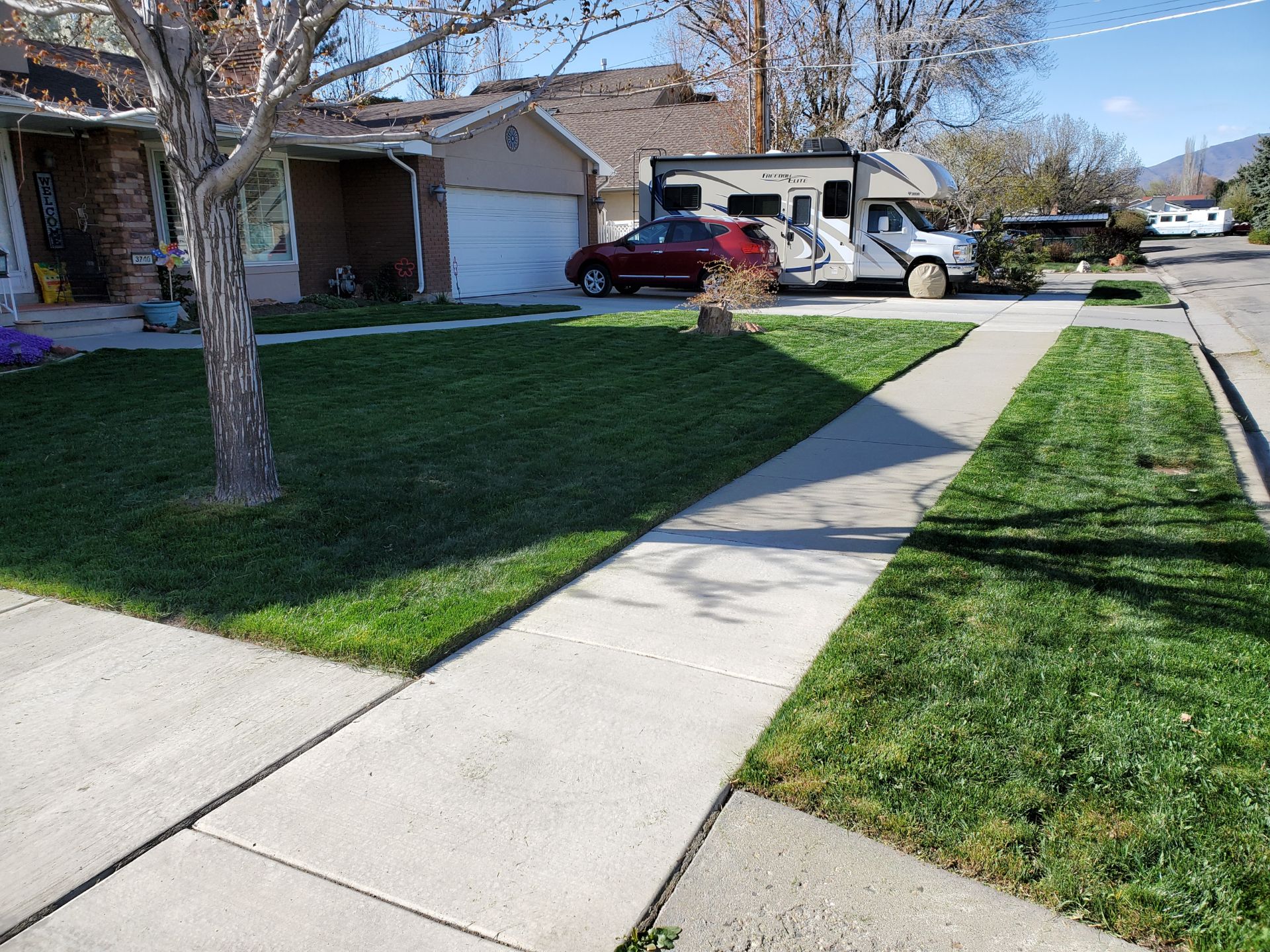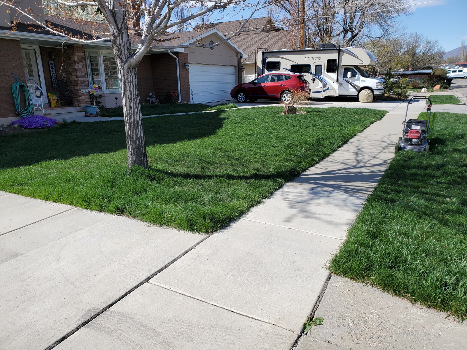 Edging: Edging is done along the outside of the lawn only. It makes your lawn have a nice clean cut between the concrete and grass.
